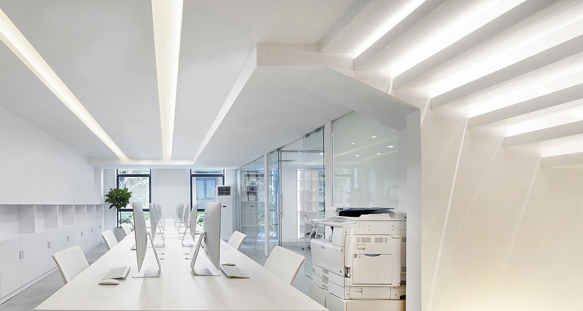 Choose "white" and "grey" as the main colors to realize the simple atmosphere and sense of science and technology in the public space. In addition to creating certain visual stimulation and reducing visual fatigue, it is also an effective way to indirectly convey corporate culture and form a bond between space and culture. The meeting room space constructed with polyhedrons and special-shaped geometry shapes the company's spirit of breaking the convention and being brave to innovate. The interaction between design, space and furniture is the key to office space design. The efficient office environment conveys the beauty of coordination among people, things and things.