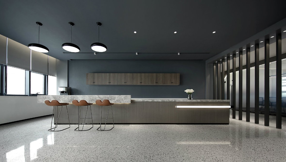 會議室和水吧是空間的核心筒,由此形成一個環(huán)形的動線。客人與員工進(jìn)入公司分別有不同的路徑,員工通過刷卡可以從側(cè)面入口更有效的進(jìn)入辦公區(qū)域。來訪的客人則需要環(huán)繞會議室外圍一圈進(jìn)入公司區(qū)域,這樣的設(shè)計,能讓客人沿途參觀到公司項目和部分工藝與材料的展示,讓到訪者更好地了解公司的各方面業(yè)務(wù)能力。空間最深處是最重要的辦公區(qū)域。一側(cè)靠窗,另一側(cè)我們規(guī)劃為洽談室,在這里可以更方便的做小型的會議交流。對于辦公室的空間規(guī)劃,我們讓員工與領(lǐng)導(dǎo)的辦公空間有一定的間距與分隔,這樣可以讓各自更放松的投入到工作中。
