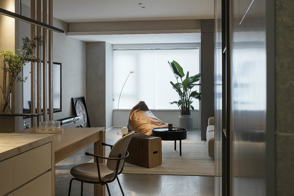 整體色調以高級灰主,色彩獨有的視覺感賦予了空間沉穩且略顯冷靜的氣質,幾何造型的燈飾精致而大氣,沙發與桌椅線條感十足,不僅提升了客廳的藝術感,也為空間帶來了更加豐富的層次變化。深色的墻面和淺色的地毯利用線條勾勒空間,層次分明、以簡盛繁,低調而內斂。藝術品整齊地擺放于木制置物架上,常看的書籍也可以收納于此。