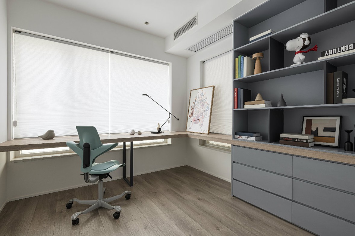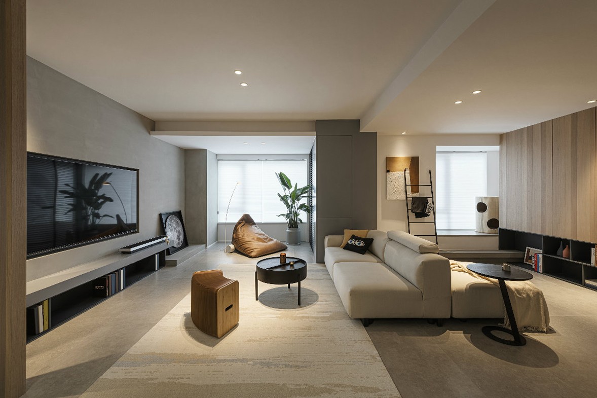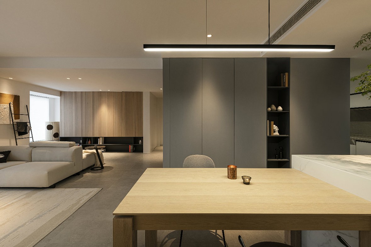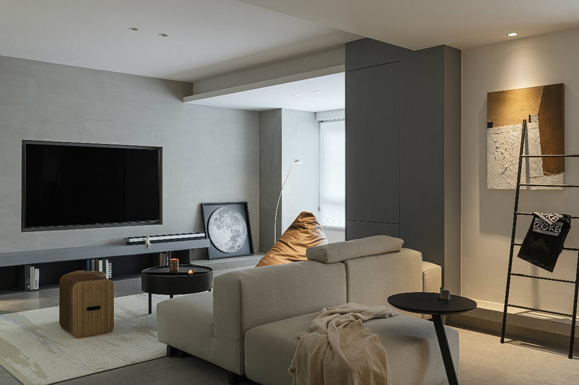 The overall tone is mainly gray, the unique visual sense of the color gives the space a calm and slightly calm temperament, the geometrical lighting is exquisite and atmospheric, and the sofas, tables and chairs are full of lines, which not only enhances the artistic sense of the living room, but also The space brings richer level changes. The dark walls and light-colored carpets use lines to outline the space, with clear levels, simple and prosperous, low-key and restrained. Artworks are neatly arranged on wooden shelves, and frequently read books can also be stored here.