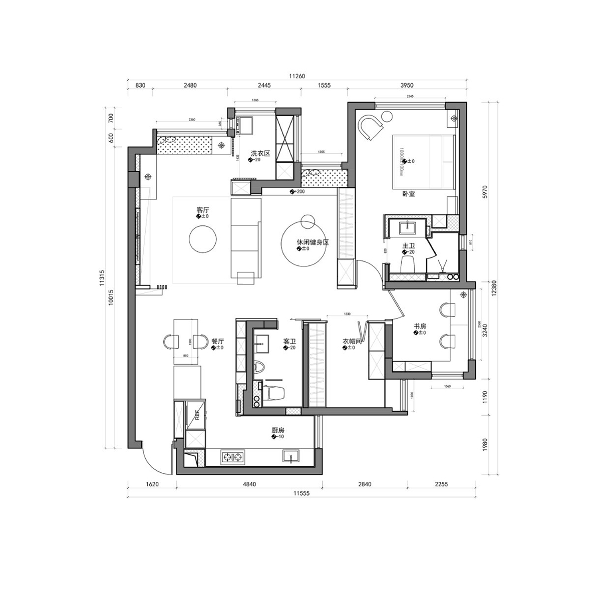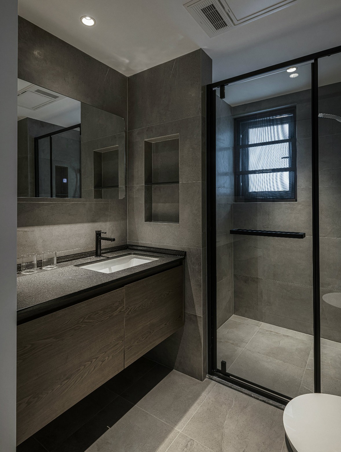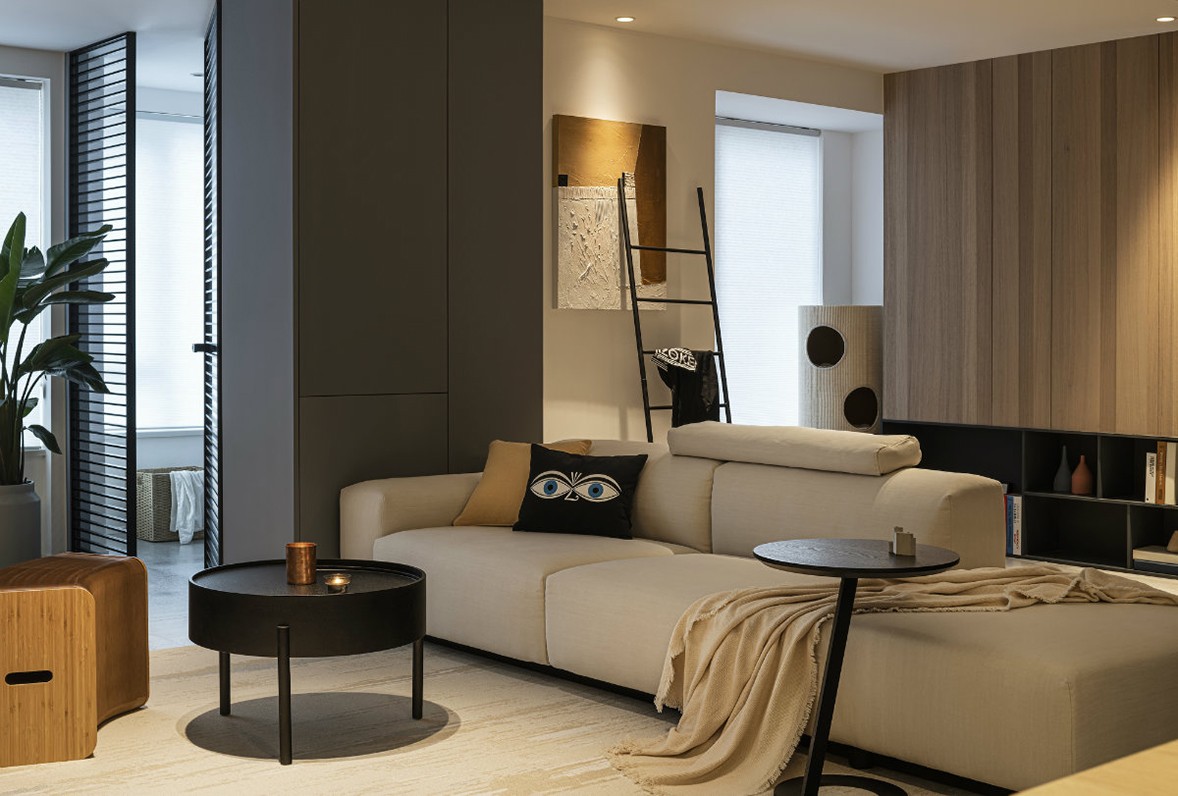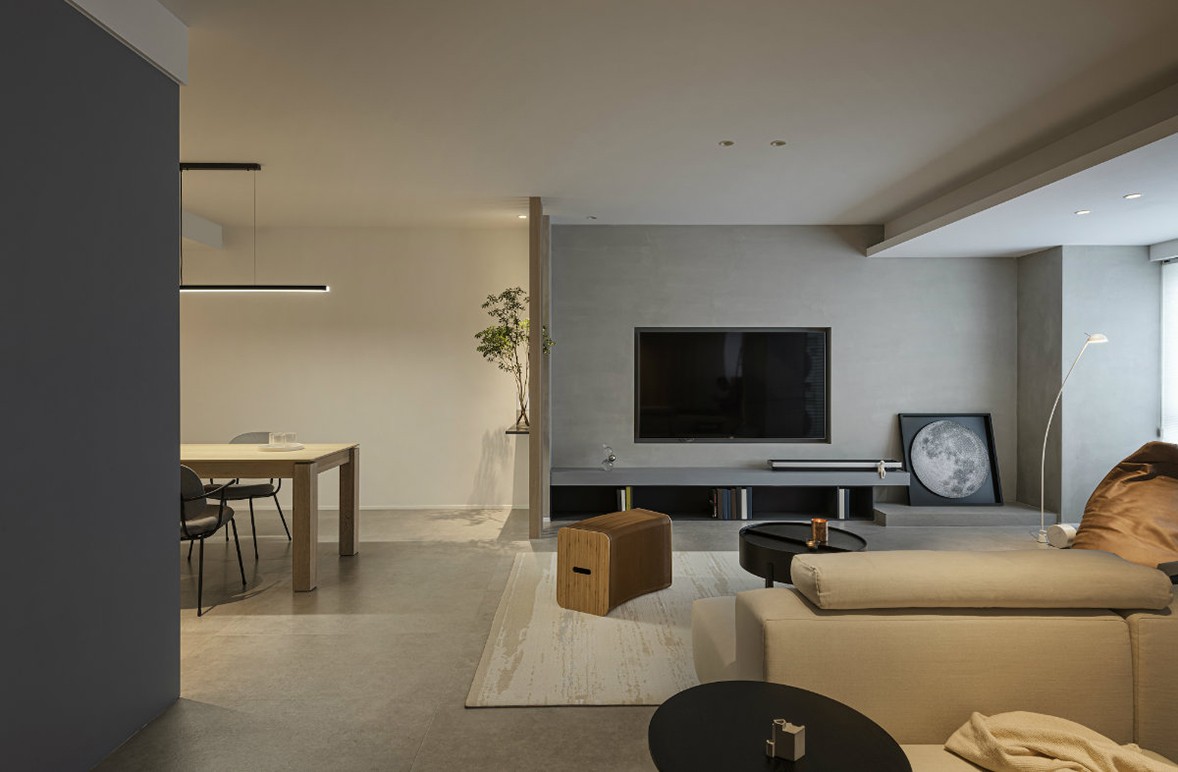 The overall tone is mainly gray, the unique visual sense of the color gives the space a calm and slightly calm temperament, the geometrical lighting is exquisite and atmospheric, and the sofas, tables and chairs are full of lines, which not only enhances the artistic sense of the living room, but also The space brings richer level changes. The dark walls and light-colored carpets use lines to outline the space, with clear levels, simple and prosperous, low-key and restrained. Artworks are neatly arranged on wooden shelves, and frequently read books can also be stored here.